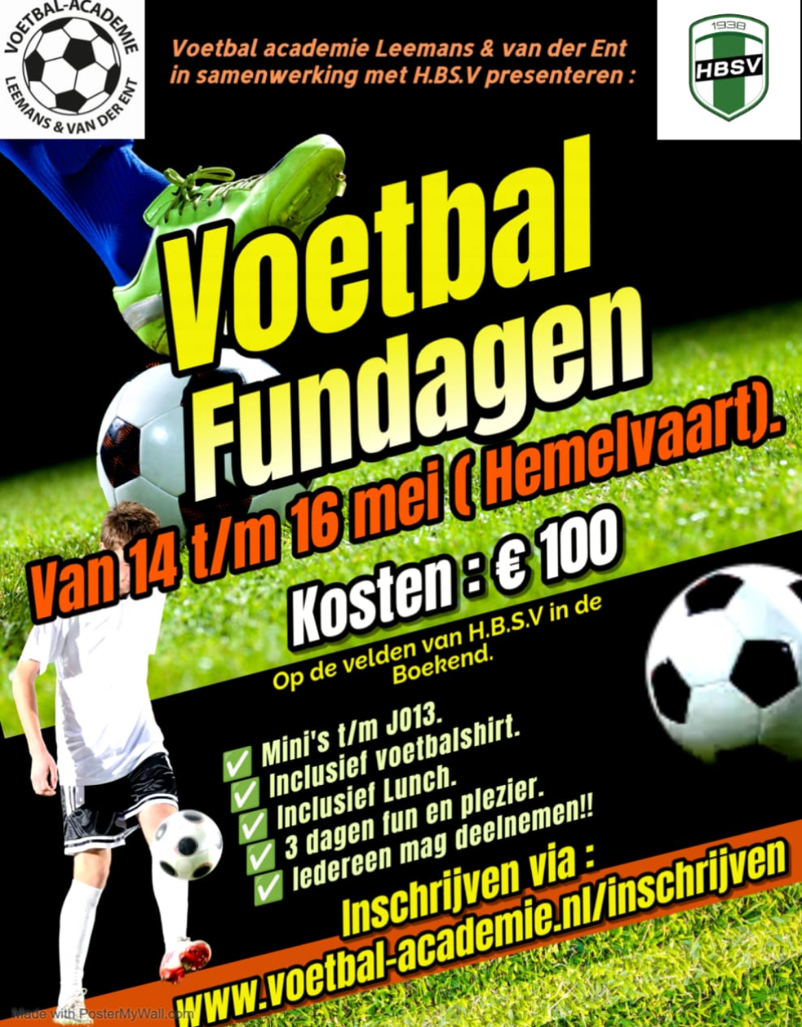 De voetbal fundagen komen er weer aan. 3 dagen lang voetballen, plezier en vriendschap. Deelnemen is mogelijk voor iedereen. Jongens en meiden van mini's t/m JO13. Dit alles op de voetbalvelden van HBSV, let op: Locatie is de Boekend.